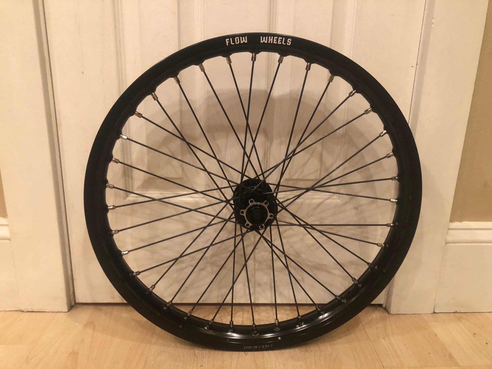 This front set up is a major compliment to the 16" rear whel set up. Free shipping in continental USA. Plug and play on all Surron forks. This is a unique wheel build. The stock Surron Segway front wheel is made from low quality aluminum and is a skinny 1.45" wide. This rim is high quality FlowWheels 7000 series aluminum and is a solid 1.60" wide. Thats the width of a 21" rim so this gives the rider a much more planted feel. A must for those already running a 16" rear wheel setup.  These only come with black spoke nipples. The Dunlop MX34 is too wide for a RST fork. However, if you have the RST fork I can mount a Bridgestone Motocross M203 70/100x19. It's much skinnier than the mx-34 so it will fit the rst fork. Spokes are 12g stainless. Feel free to ask any questions. Thanks!