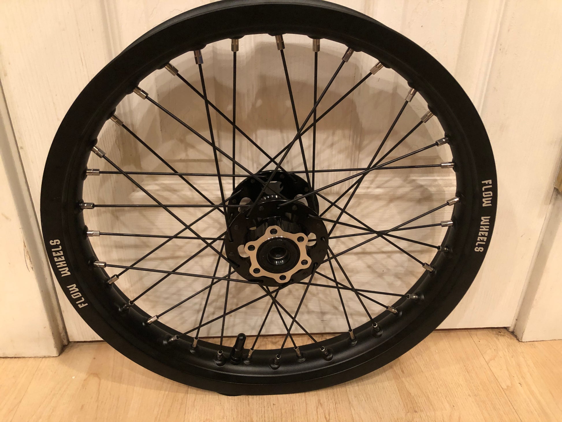 This is a new 16x1.85" rear wheel set complete with rim strip and billet rim lock installed. This is hands down the best setup for people that don't have a upgraded power system. Insane traction and stability when compared to the stock wheel/tire without adding much weight like the 18" tires do. Better yet it works great with your stock 19" front wheel. These are plug and play. FlowWheels pre-dished billet hub, FlowWheels 7000 series aluminum rim, 12g stainless black or silver spokes and stainless silver spoke nipples You will use your own hub spacers, sprocket, and brake disk, tire, and tube. They do come with a very slight dish for proper chain clearance when mounting a full moto tire. I will need you to email me as to what tire you will be mounting. I now also have 19x1.6 wheels for those who want a wider and more stable/solid front wheel than the stock one. Feel free to ask any questions. Thanks!
