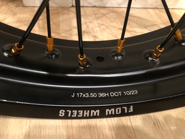 I noticed many Supermoto wheel sets that are coming out for the Ultra Bee are sized for a full-size 450 Supermoto bike. In my opinion that heavy of a wheel set will take away the liveliness of this bike. This is not a full sized bike. So I've decided to go with what I feel is an appropriate size setup for this bike in the Supermoto world. My rear rims are 17x3.5 and the front rims are 17x2.5. I believe this size rim set is more than adequate for this bike while keeping the playful handling. I noticed many people with the Light Bee just want to get the biggest and fattest tire they can find and stuff it back there. I get asked this all the time.... what's the biggest tire? Many of us have been down that road only to be disappointed, including myself. I'm only going to be offering these wheel sets in all black with gold nipples.